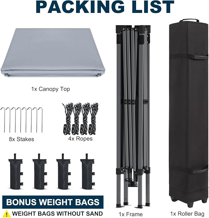 - Package includes: 1 Canopy Frame, 1 Canopy Top, 4 Sand Bags, 4 Ropes, 8 Stakes and 1 Wheeled Bag, which is crafted of 600D PVC coated fabric with reinforced handles.