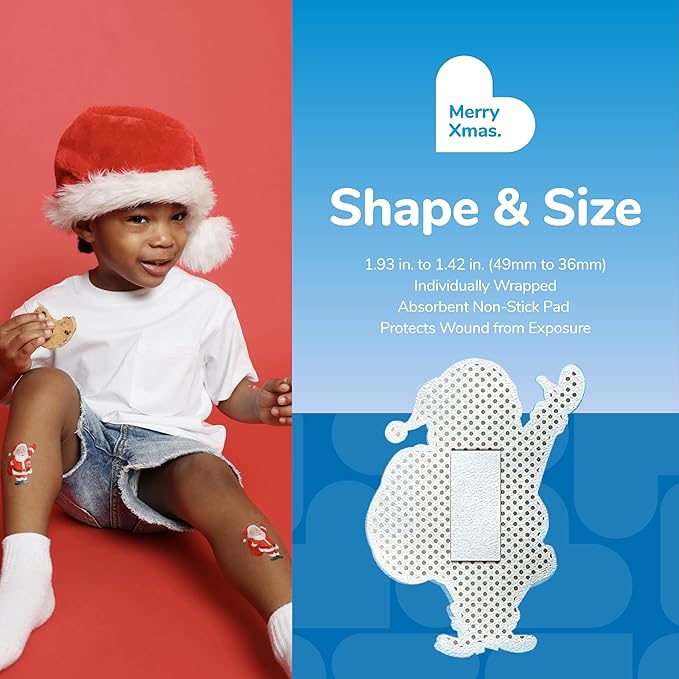 - SANTA CLAUS BANDAGES: This 50 piece tin of adorable Santa Claus bandages is great for putting a smile on kids' faces while protecting wounds such as cuts, scrapes, and burns; sticky bandages are perfect for kids and adults alike, and also for school nurses and pediatric doctors