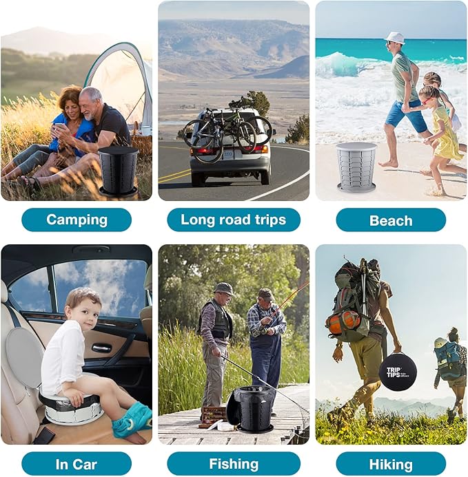 - 【MULTI-FUNCTIONAL】 Functional cover design, makes you free to switch various modes of use, as a camping toilet, a collapsible stool, a storage box,a side table or a trash can. It is not only a perfect portable toilet for camping, hiking, long trips, fishing, boating, traffic jam etc. But also a good portable potty for adults and kids indoor.