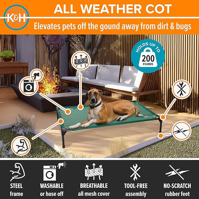 - ELEVATED DOG COT: Raised dog bed helps pets stay cool in summer months by allowing air to circulate and keeps pets off wet/cold ground with maximum ground clearance