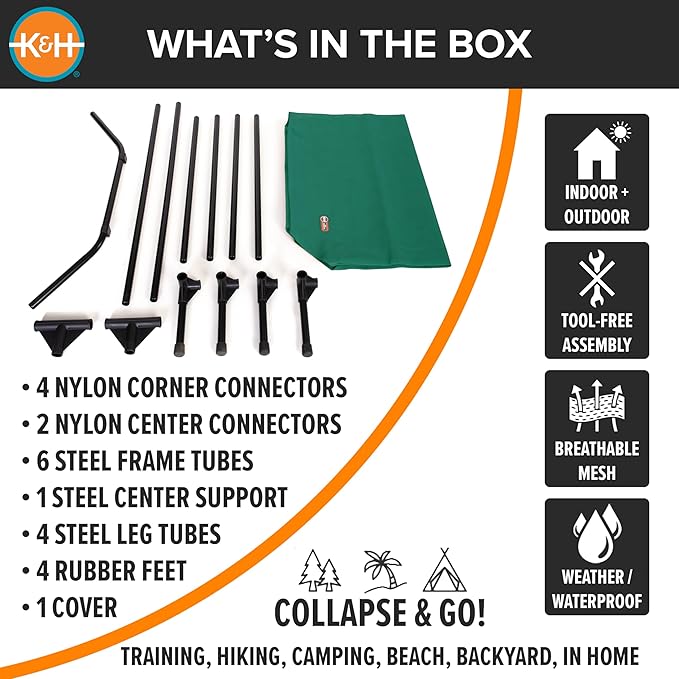 - EASY TOOL-FREE ASSEMBLY: Collapsible outdoor dog cot is easy to assemble and disassemble, no tools necessary making this portable bed great for use at home or during travel, camping, picnicking, place cot for dog training and more