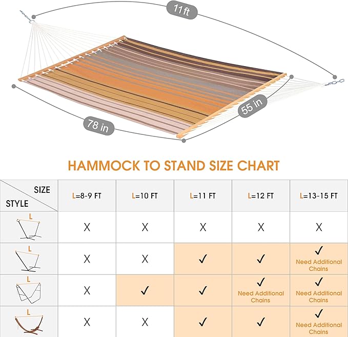 - 【Lazy Daze Hammocks】 Lazy Daze Hammocks is large enough to accommodate 2 person. The hammock bed size is 78 inch x 55 inch, 11 Feet hammock with 2 steel chain links.