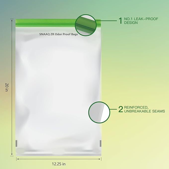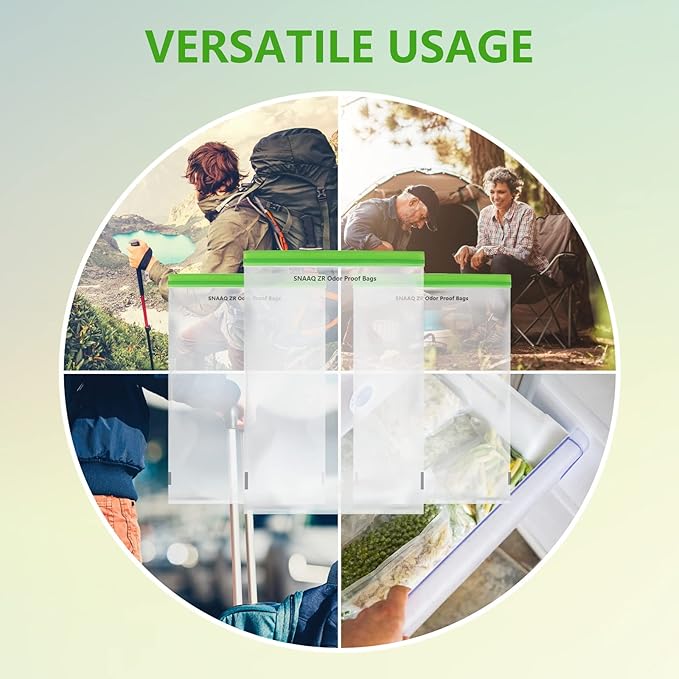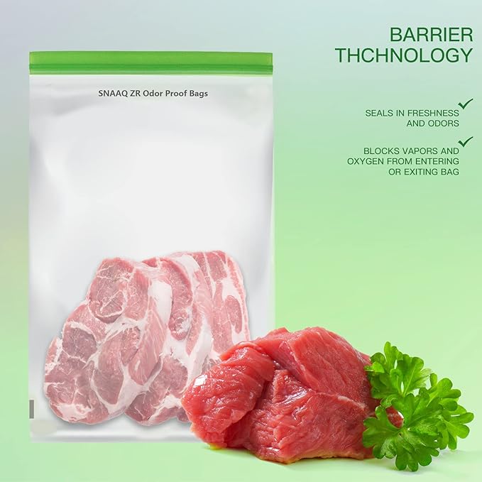 - 【KEEP FOODS FRESH】The SNAAQ ZR Odor Proof Storage Bags prevent air-sensitive foods from getting stale. Keep your meats, vegetables, fruits and breads freshly stored to lengthen the food’s shelf life, and keep open barrier bag packages covered to prevent the food from going stale or spilling out.