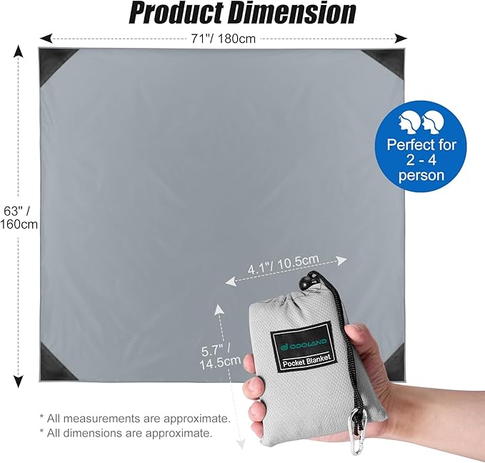 - 【Suitable For 2-4 Person】: Suitable for family Couple to picnic. Perfect to outdoor hiking for 2 to 4 people. It offers enough space that 4 adults can lie down. Size 63" x 71"/210cm x 236 cm, lightweight only 110g, foldable, ideal outdoor beach blanket for vacation.