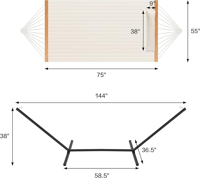 - 【Extra Large Size & Extended Space】With full size 144 inches(L) *55 inches(W) *38 inches(H) this hammock is big enough for two adults. Equipped with added detachable book bag & cup bag this hammock offers more storage space for your leisure time.