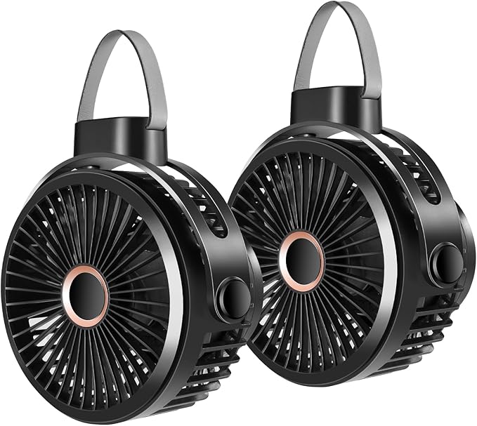 Odoland 2 Packs 10000mAh Camping Rechargeable Fan with Hanging Hook Carabiner, Portable Battery Operated Tent Fan, Quiet Strong Airflow, Outdoor USB Desk Fan for Picnic Travel Barbecue Fishing