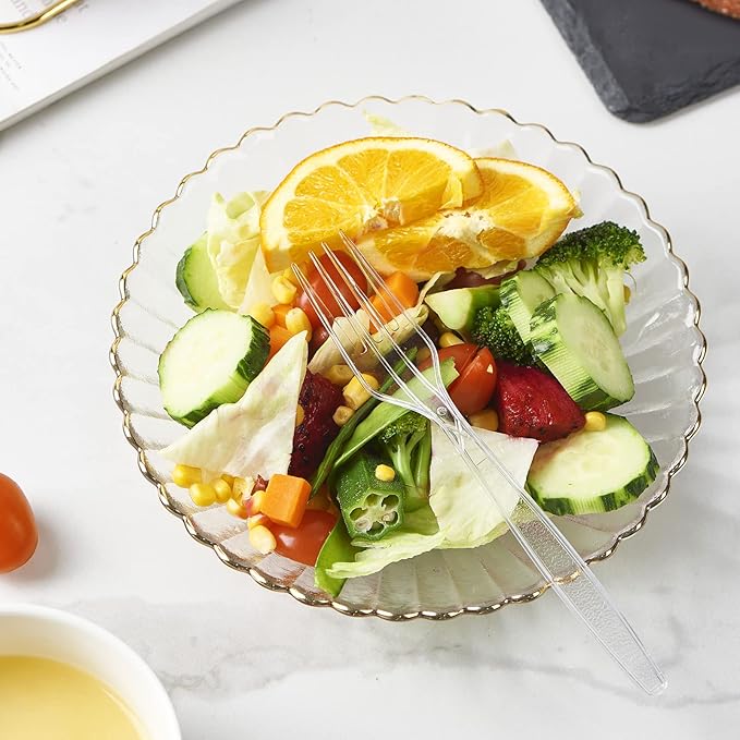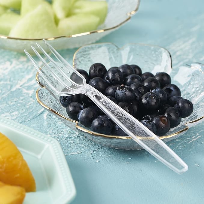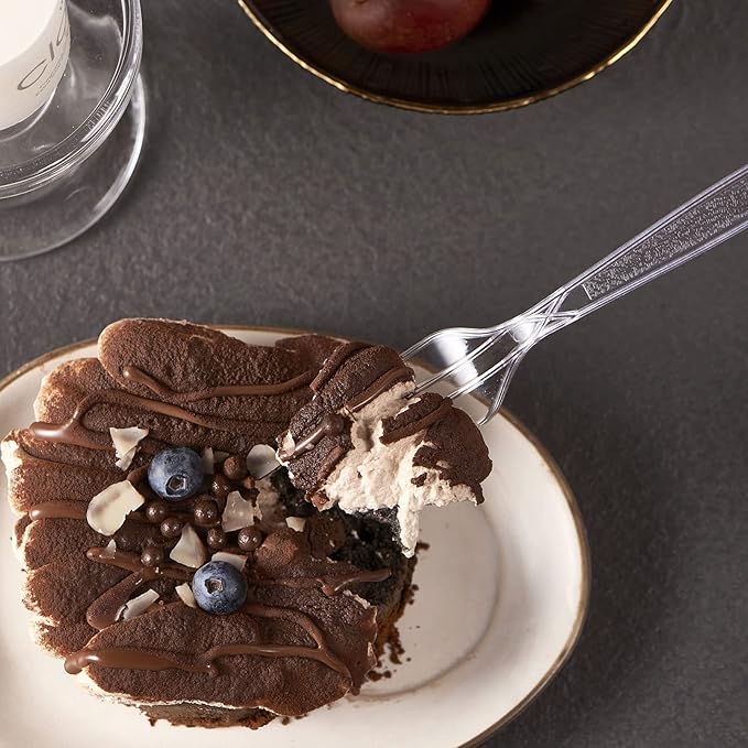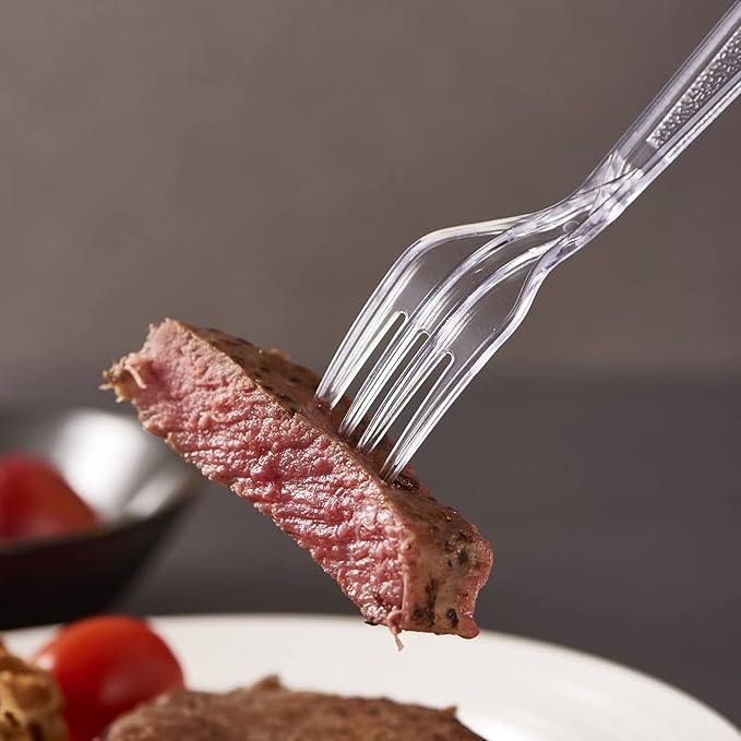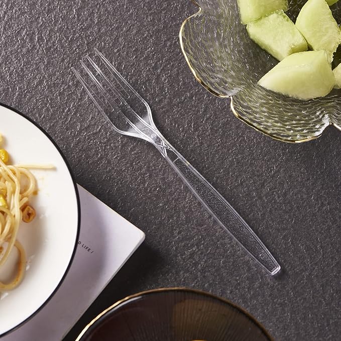 - Elegant Designe - The fancy design make the forks perfect for any event, occasion, party, weddings, picnic, or indoor and outdoor activity. Crystal clear color adjusts with any silverware utensils. The handle features an intricately engraved design to add a touch of sophistication to your table set. Thanks to its smooth, rounded edges, the plasticware fork provides a comfortable dining experience for your customers.