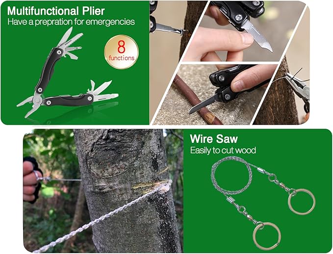 - FIRST AID & SURVIVAL KIT: We add some survival supplies in this kit on the base of first aid kit like a multi-function plier, a wire saw etc to help you solve more complicated problems in the wild. All first aid supplies are manufactured from modern approved facilities, which won't let you down.