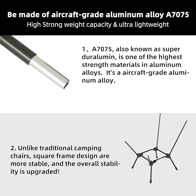 - NEW DESIGN: Compared to our classic ultralight camping chair, the new design uses a new square frame structure, more stable and more comfortable. It is increased to 4 support points to distribute the weight, better stability and balance, and stronger load-bearing capacity