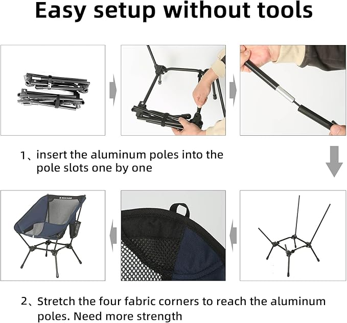 - INSTALL IN SECONDS: Lightweight aluminum pole system with hand guide connection. The folding chair's shock corded main frame allows you to guide the connected poles directly into the frame. This unique design enables you to just pop it open, attach the seat fabric and You are ready to go! Rope ring design makes the assembly process more easy and labor-saving
