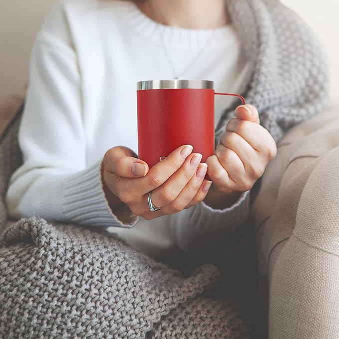 - The 14oz coffee mug with a handle fits most hands, making it easy to hold. It comes with two BPA-free lids – a sliding lid and a flip straw lid – allowing you to switch as needed