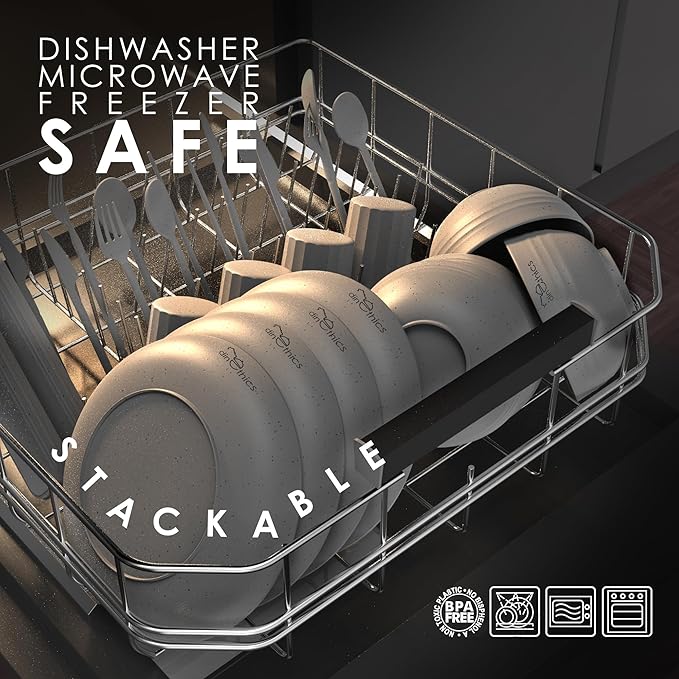 - ROUND EDGED, STACKABLE & NON STAINABLE : Our Lightweight Dinnerware Set Is Hassle Free, Stackable & Space Efficient. These Dorm Kitchen Essentials aka Rv Dinnerware Sets Are Easy To Wash, Stain Resistant & Travel Friendly Providing The Absolute Value For Money.