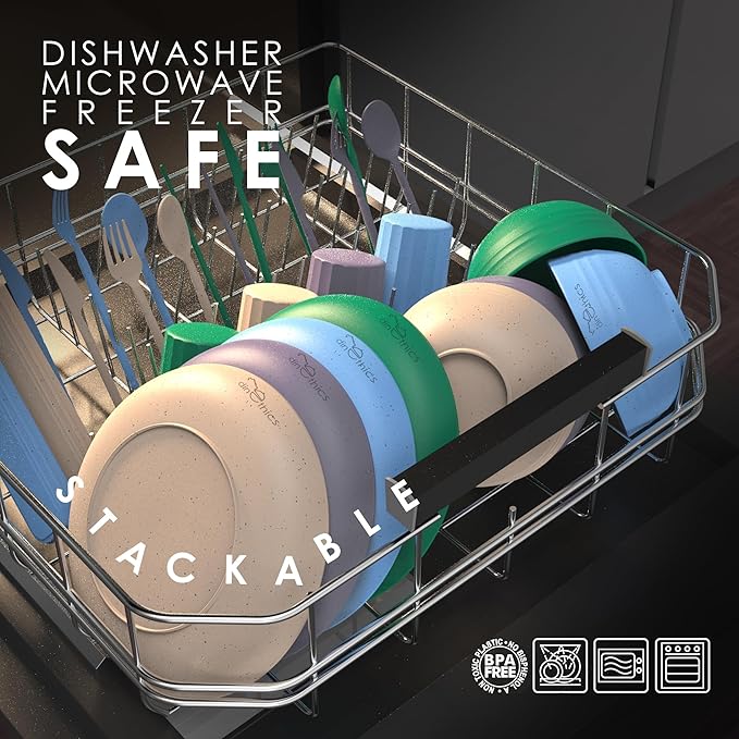 - STACKABLE & NON STAINABLE : Our Lightweight Dinnerware Set Is A Healthy Alternative To Plastic Dishes Set. The Dorm Kitchen Essentials aka Rv Dinnerware Sets Are Stain Resistant & Travel Friendly!