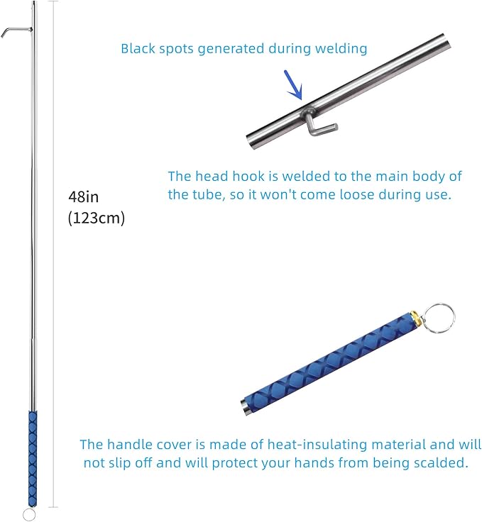 - The fire poker also has a multifunctional design that can be used as a bellows, making your outdoor life more convenient and efficient. With its 49-inch super-long design, it can easily handle fire pits and grills