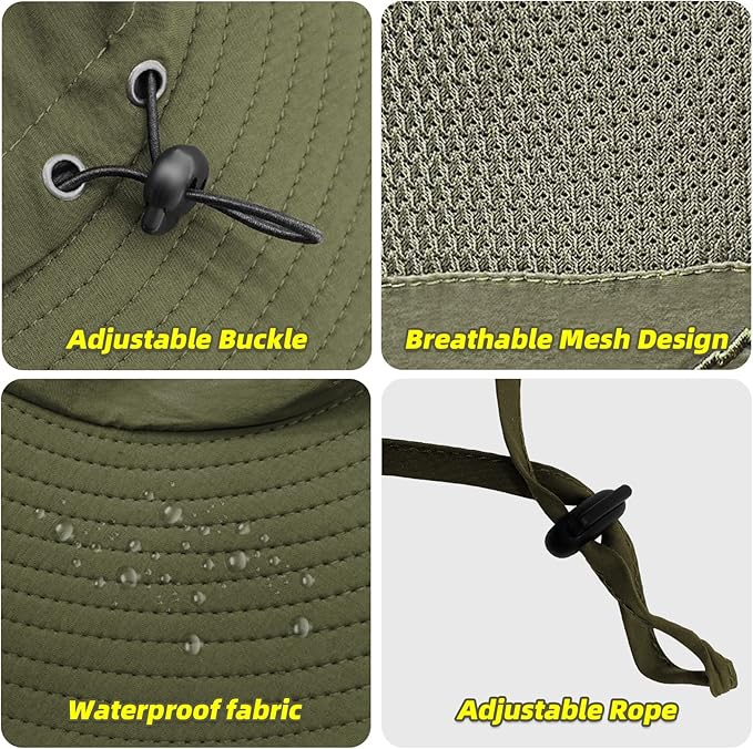 - Cool Net Mesh -- The Back Of The Hiking Hat Is With An Adjusting Buckle, And The Design With Adjustable Chin Strap Ensures The Hat Stays Put Even In Windy Weather. The Net Mesh Sun Shade Hat Keeps You Cool And Also Allows It To Be Used Even In Light Rainy Days.