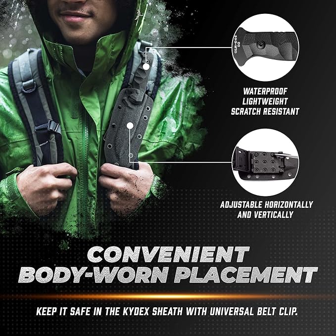 - KYDEX SHEATH WITH BELT CLIP Lightweight and durable Kydex sheath with multi-position tactical clip. Adjust for vertical or horizontal carry. Fits most belts, backpacks, MOLLE systems, and tactical vests.