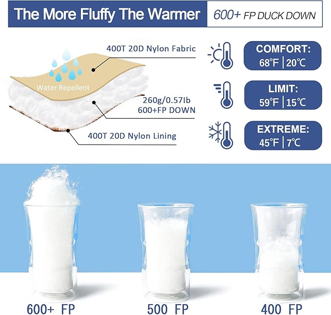 - γ ππππ ππππ γThe camping sleeping bag is filled with 9.2oz selected duck down with 600 Fill Power, suitable for warm weather. Pure natural and healthy material, fluffy and soft, no odor or impurities. The sleeping bag specially adds a 1.6 " cloth strips for wind protection. Comfortable Temperature:59Β°F-68Β°F, Limited Temperature: 45Β°F, your great choice for summer sleeping bag!