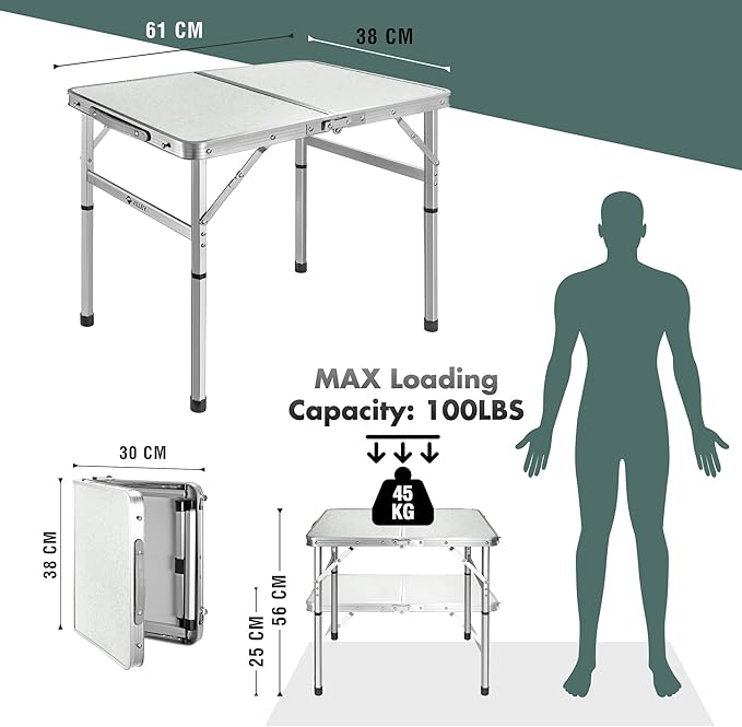 - Lightweight & Portable: VILLEY folding table makes a convenient place for friends and family to cook, eat, and play games. Designed with sturdy aluminum, this portable table weighs only 4.62 pounds. It can fold in half to a compact size, making it easy to carry or store in a compact space when not in use
