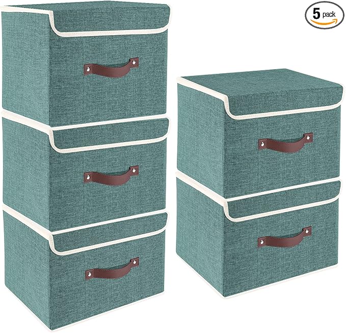 TYEERS Foldable Storage Boxes with Lids 5 Pack Fabric Storage Bins with Lids, Closet Organizers for Clothes Storage, Room Organization, Office Storage, Toys - Aqua Deep