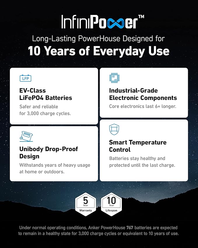- [Longest-Lasting 10-Year Lifespan] - With InfiniPower's long-lasting technology, Anker PowerHouse 767 is built to last over a decade, even with everyday use.