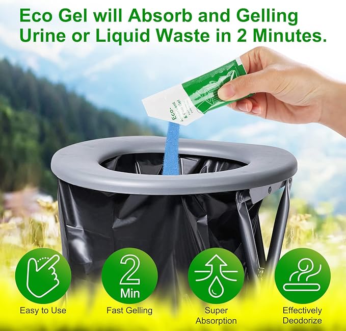 - Emergency Preparedness - You May need something like this for your emergency toilet. Perfect for no access to modern conveniences. d to your camping poop bag/camping shower bag to work with biodegradable waste bag and portable foldable toilet.Biodegradable Portable Toilet Absorbent Gel is also suitable for portable toilet for tailgating, RV toilet treatment, travel toilet, portable potty, camp toilet or portable toilet for home use. Avoid confusion , no need to waste water to clean the toilet