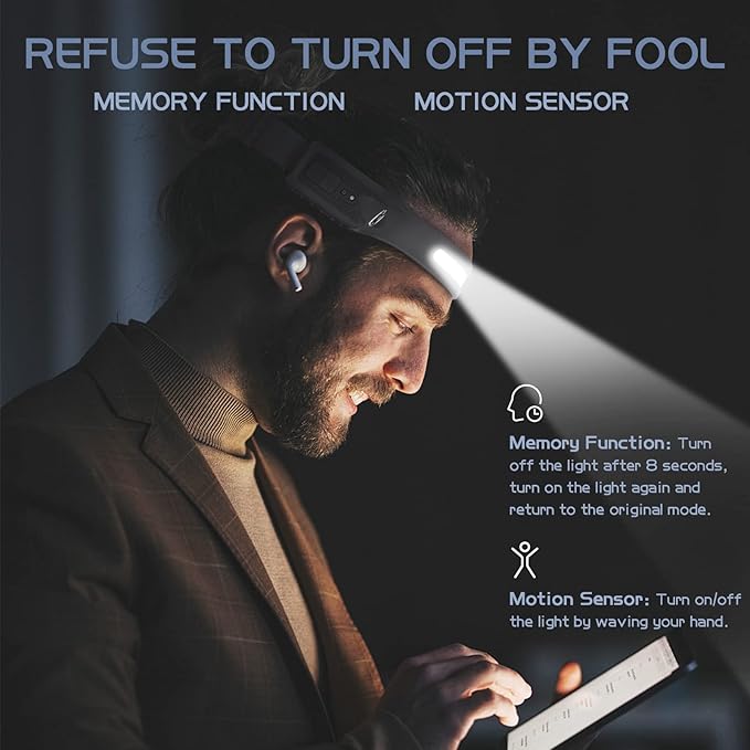 - Memory Function and Motion Sensor: The headlamp automatically recalls the previous brightness level and can be turned off after 8 seconds of use; It also features a motion sensor for easy operation; Just activate the sensing switch and wave your hand
