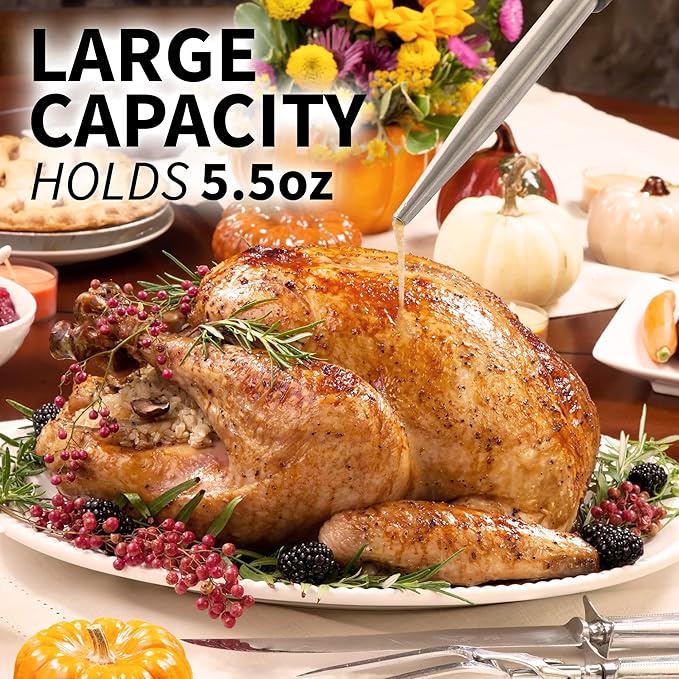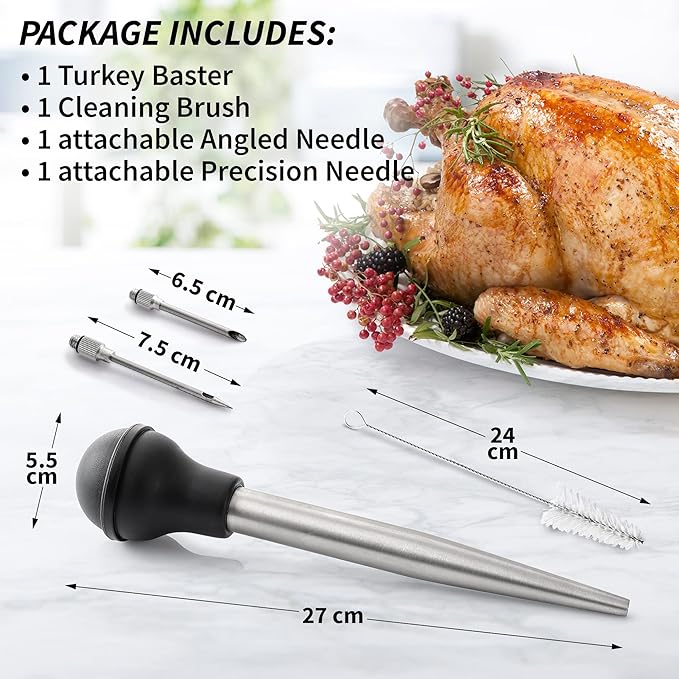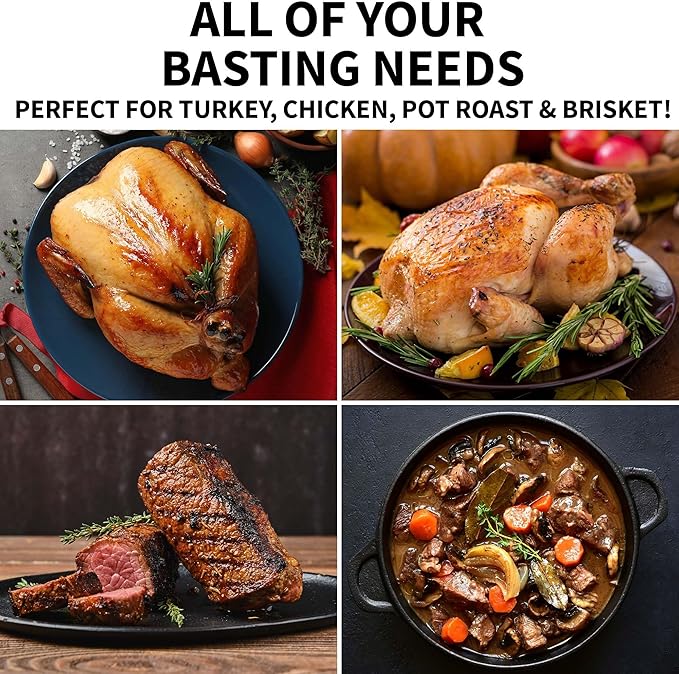 - IDEAL BASTER FOR COOKING: Impress your family with a juicy, meaty feast at a family, Thanksgiving or Christmas dinner with our durable turkey baster syringe. Its stainless steel construction allows you to dip the baster in even the hottest meals, while the silicone bulb remains cool to touch (heat resistant up to 450°F).