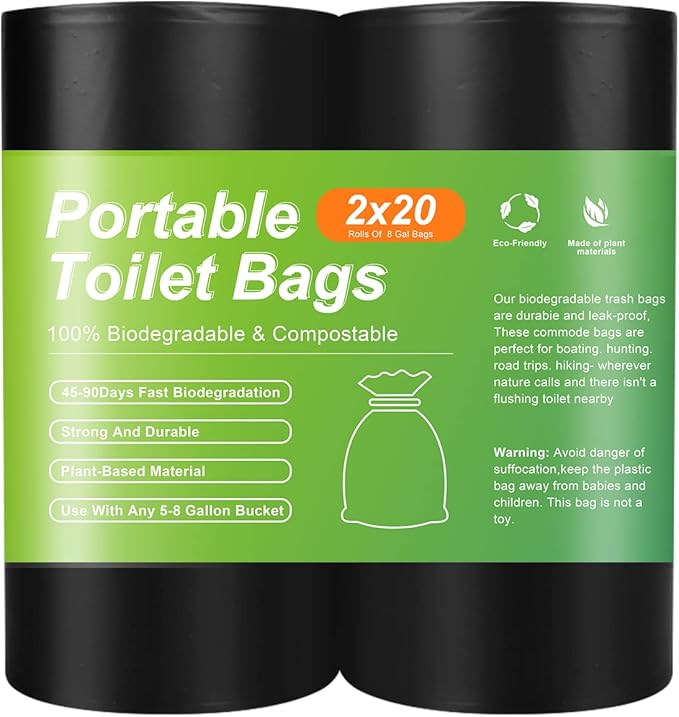 Portable Toilet Bags for Camping: 40 Liners Toilet Replacement Bags, 100% Compostable & Biodegradable, 8 Gallon Thickened Bucket Liner for Outdoor Boating Trip, Trash Bags Plastic Free