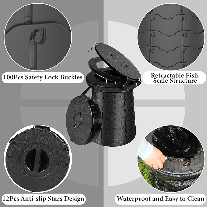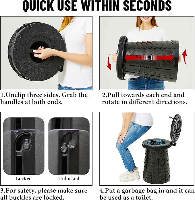 - Quick Use: The 10-layer retractable scale-like construction allows you to use the toilet stool in seconds by simply pulling the handles on each end and twisting the locking buckle counterclockwise to secure it. It's quick and easy, requiring no assembly. Please ensure all buckles are locked before use. The entire structure is waterproof, simply rinse with water and air dry after use.