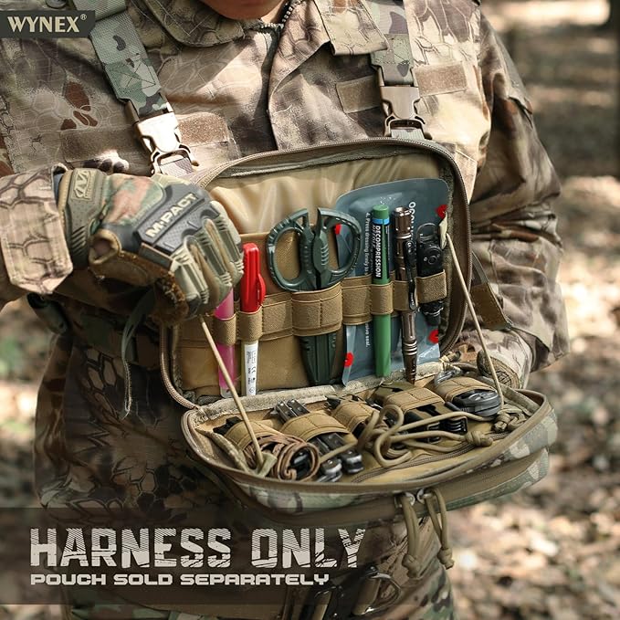 - GOOD SOLUTION TO BECOME A CHEST RIG PACK! Combat harness fit for most admin pouch of WYNEX, it's a easy and no-sew solution to switch as a chest rig in various occasions as you need. Release your hands and make you move more quickly.