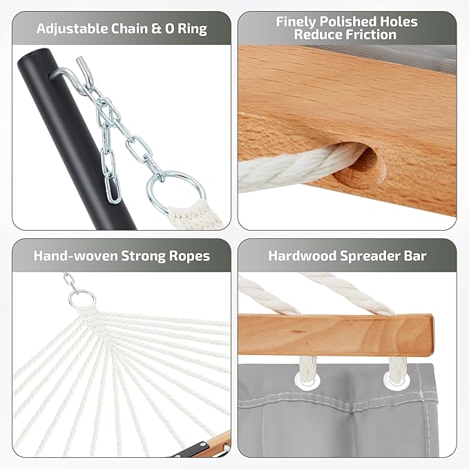 - 【Comfortable & Durable Design】Hammock with quality & coated steel stand, hand-woven strong ropes, double-layer quilted polyester fabric with poly fiber filling is durable to safely support a maximum capacity of 480 pounds. A detachable large soft pillow offers superior comfort when using.