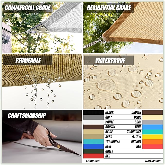 - ★【MEASUREMENT & WARRANTY】: Measurement is taken from D ring to D ring, leave 0.5 - 1.5 foot space for the hardware kit between each shade sail D ring and the mounting points, all edges are finished slightly curved so it can be stretched tightly, prevent middle from sagging, shade sails come with 3 Years full warranty, under normal weather and usage. Your 100% satisfaction is our goal.