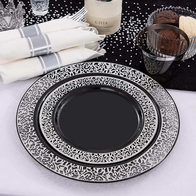 - 【PERFECT FOR ANY OCCASION】These lace design black plastic plates are classic and elegant, perfectly matched with prewrapped silver disposable silverware, so that they can be used in weddings, graduation ceremonies, birthday parties and other occasions.