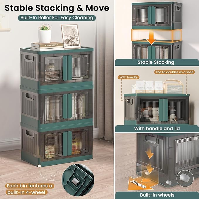 8.4Gal Collapsible Storage Bins with Lids & Wheels - 1 Pack Stackable with Doors, Heavy-Duty Plastic Containers for Home/Office, Green