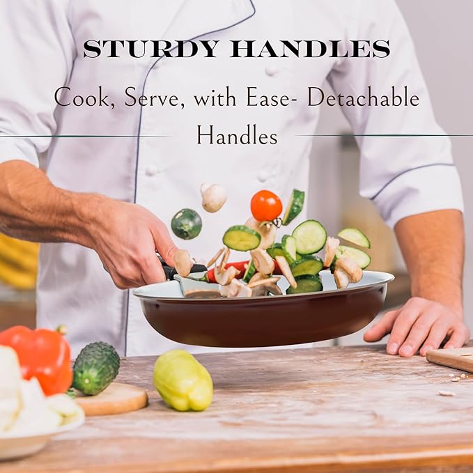 - Durable Nonstick Cookware Set: Our kitchen pots and pans set is made from top materials, thicker aluminum, more durable & stable. The edges are smooth to ensure the detachable handles are tightly held and safe. Our kitchen cookware sets are non-toxic and free from PTFE & PFOA.