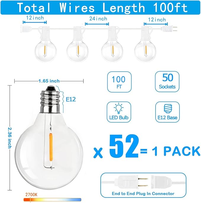 Abeja 100FT Outdoor Globe String Lights with 52 Dimmable G40 LED Bulbs, 2700K Warm Glow Waterproof Connectable Patio Lights