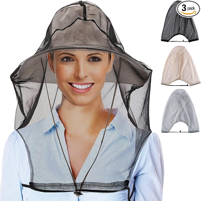 CozyCabin 3 Pcs Mesh Mosquito Head Net, Fully Covered Face Netting for Hats Head Mesh Protecting Net for Outdoor Hiking Camping Garden (Black/Gray/Begie-Large Set)
