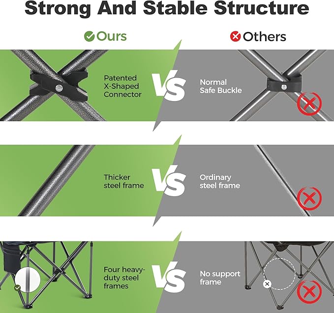 - HIGH QUALITY CAMPING CHAIR : Ergonomic padded back ,600D padded oxford fabric , durable powder-coated steel tube frame and armrests , high-quality materials only provide you with a comfortable and safe chair . Weight Capacity: 450 LBS , stable and strong