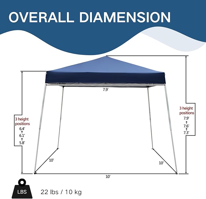 - 【OVERALL DIAMENSION】10'X10' (3m*3m)base outdoor canopy tent can hold up to 8-10 people. 3 heights to adjust. From gound to tent top: 7.3ft/7.6ft/7.9ft