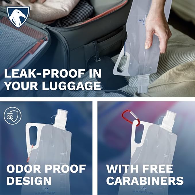 - Collapsible Water Bottle - Ideal collapsible water bottles for traveling. Each leak proof canteen can attach to any portable water filter with a 28 mm thread and holds 66oz (2L) of water.