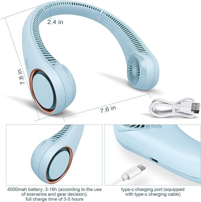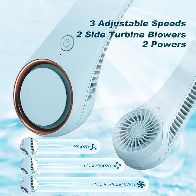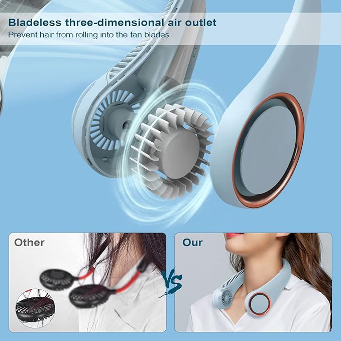 - Cool and safe: Upgraded neck fan with 78 air vents, innovative turbo fan blades and wind hole design, efficient division of air and feel the cooler breeze more gently. The design of the bladeless neck fan can be used safely by children and the elderly