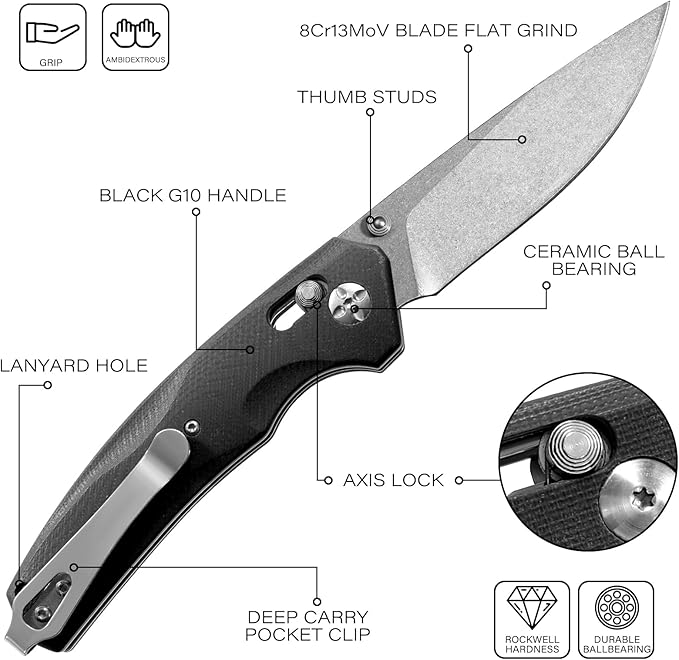 - EXCELLENT MECHANISM: In order to ensure smooth and fast operation, we've outfitted pocket knives with brass ball-bearing pivot construction and axis lock which allows for quick and snappy one-handed deployment by thumb stud and smooth closing action