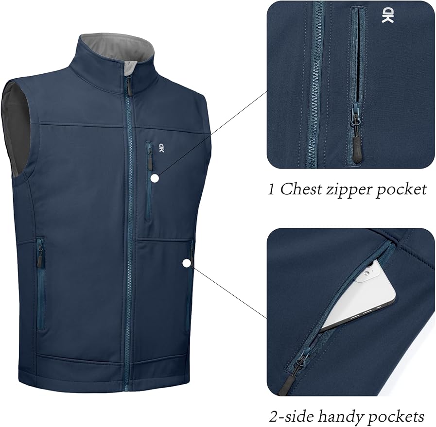 - Outdoor Vest for Men ---- This men's vest is made of soft shell fabric which is smooth with a little stretch, wipes off easily and is washable. Resists abrasion and scratches, great for work and outdoor activities such as golf, running, jogging, hiking, fishing, climbing, cycling, traveling,workout and so on. Keeping you warm and comfortable