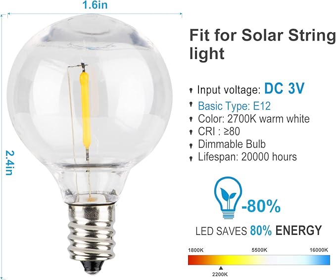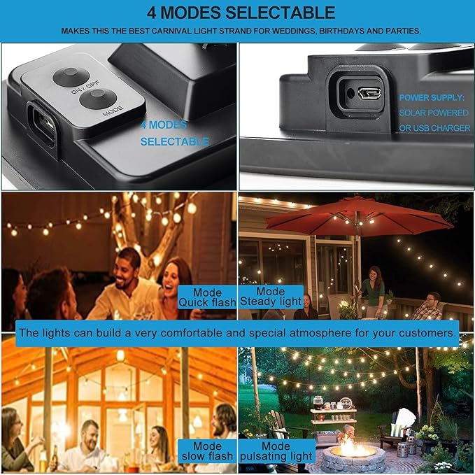 - โ 4 MODES SELECTABLE&PLASTIC LED BULBS ๐ก Solar LED string lights outdoor Quick flash &Steady light &Slow flash &Pulsating light with 4 modes selectable Makes this the Best Carnival Light Strand for Weddings, Birthdays and Parties.The lights can build a very comfortable and special atmosphere for your customers.0.8in LED filament high brightness lasts long enough to light up all night through and Plastic S14 Patio Lights Shatterproof Plastic more safety and energy saving.