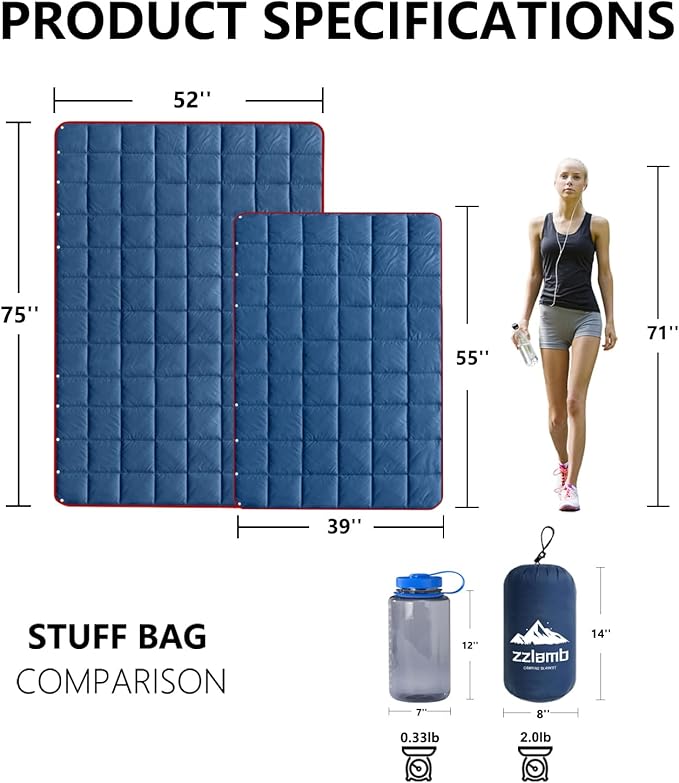 - Measurements: The puffy camping blanket for adults measures 52” x 75” when laid flat and 7” x 14” when packed. For adults, please choose 52’’x75’’. If adults or big-boned kids bought the size of 35’’x59’’, it might be a little bit small. Filled with 100% recyclable materials, the weight of the blanket is only 1.54 lbs. It is both warm and comfortable