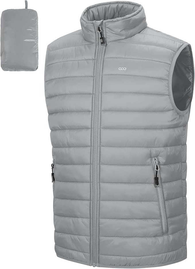 - LIGHTWEIGHT ZIP UP VEST OUTERWEAR WITH 5 POCKETS---This 33,000ft ultra-light weight quilted vest for men is extremely lightweight and warm. 2 outer zip-up hand-warmer pockets and 1 inner chest zip pocket for storing your stuff safe and secure. 2 patch pockets are perfectly sized for your cell phone, wallet, gloves, etc.