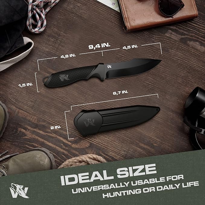 - HIGH-QUALITY MATERIAL - The fixed blade hunting knife with sheath is made of a single piece of strong D2 steel. The steel is characterized by rust resistance, resilience, and robustness. This makes the full tang knife a faithful companion.