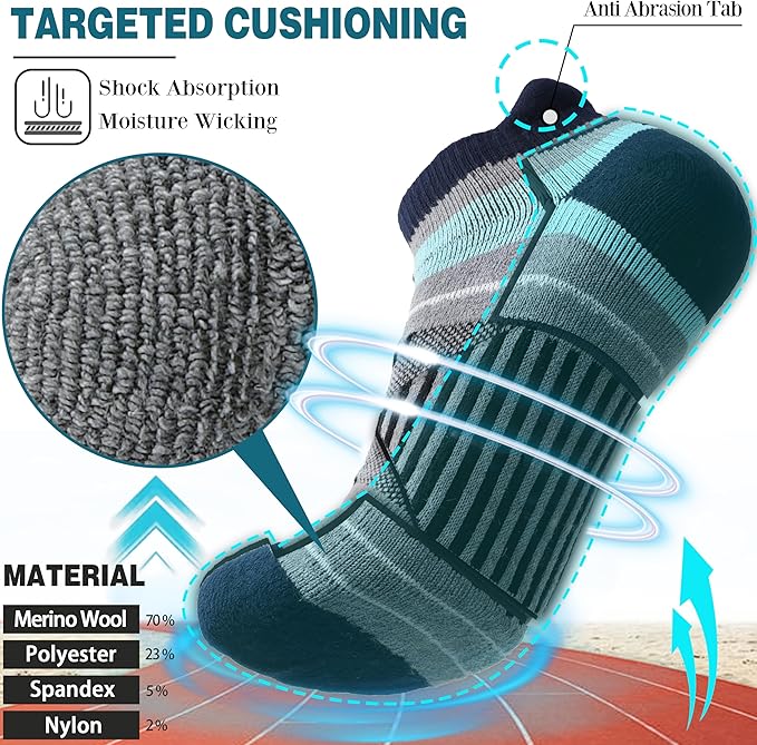 - SELECTED MATERIAL - These hiking ankle socks for women & men are made of 70% MERINO WOOL, 23% polyester, 5% spandex , 2% nylon. They can keep the temperature and warm up your feet in cold weather. And the premium merino wool has great odor resistant property.