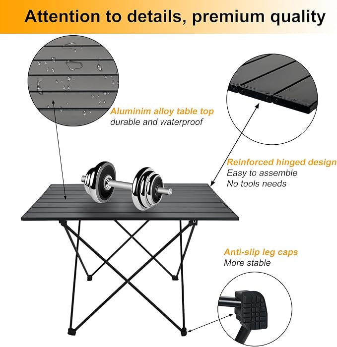 - Sturdy Collapsible Table: Aluminum camping table come with a firm X-shaped frame that is very stable when unrolled. Non-slip rubber caps make the foldable side table safe and secure on any ground. This picnic table for grill is more water-proof, rustproof and easy to wipe clean. Solid design can sustain maximum 55 pounds