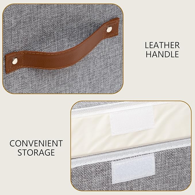 - Design of Storage Box Handle: The clothes storage bin has 1 widened and thickened faux leather handles, brown leather handles add a classic touch, allowing to lift or move the large storage boxes easily, which are hard to be broken
